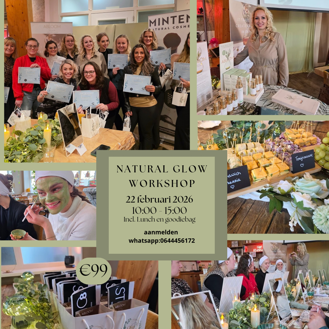 Tijdens deze volledig verzorgde workshop geniet je van een uitgebreide lunch, leer je alles over natuurlijke huidverzorging (Abloom slow Skincare) en ontdek je hoe je zelf een mooie dag- of avondmake-up maakt met Mintens Natural Cosmetics. Je gaat naar huis met een goed gevulde goodiebag én natuurlijk een stralende Natural Glow.