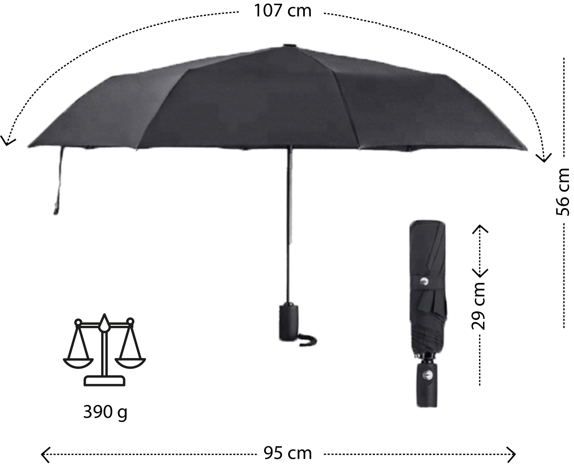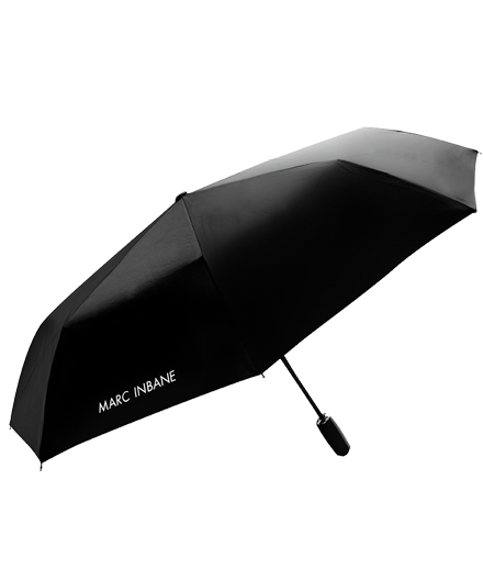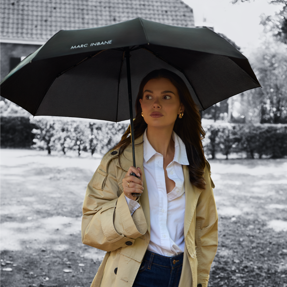 Luxe stijlvolle paraplu met waterafstotende teflonlaag, ingebouwde automatische opening, stevig lederlook handvat en anti-windbescherming. Met de branded umbrella van MARC INBANE straal je van top tot teen, ook als het regent!