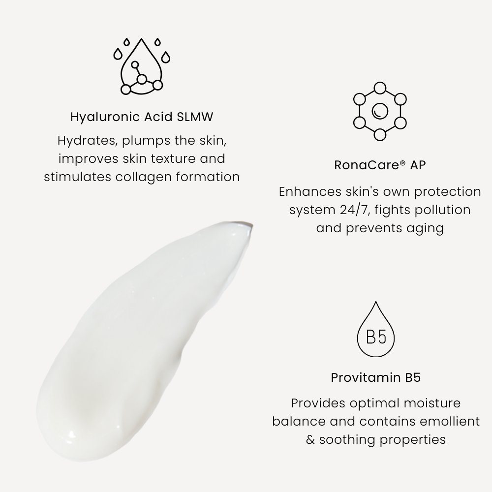Het geavanceerde ingrediënt RonaCare® AP werkt 24/7 om het huideigen beschermingssysteem te verbeteren, vervuiling te bestrijden en veroudering te voorkomen. Bovendien heeft het een significante en positieve invloed op de onzuivere huid door vermindering van vettigheid, roodheid en ontstekingen.