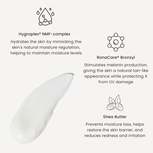 Verzorgende & vochtregulerende dagcrème op basis van RonaCare® Bronzyl. RonaCare® Bronzyl stimuleert de melanineproductie voor een subtiele glow na enkele dagen gebruik en versterkt de natuurlijke UV-bescherming in de huid. Hierdoor bruint de huid sneller in de zon en zal je minder snel verbranden!
